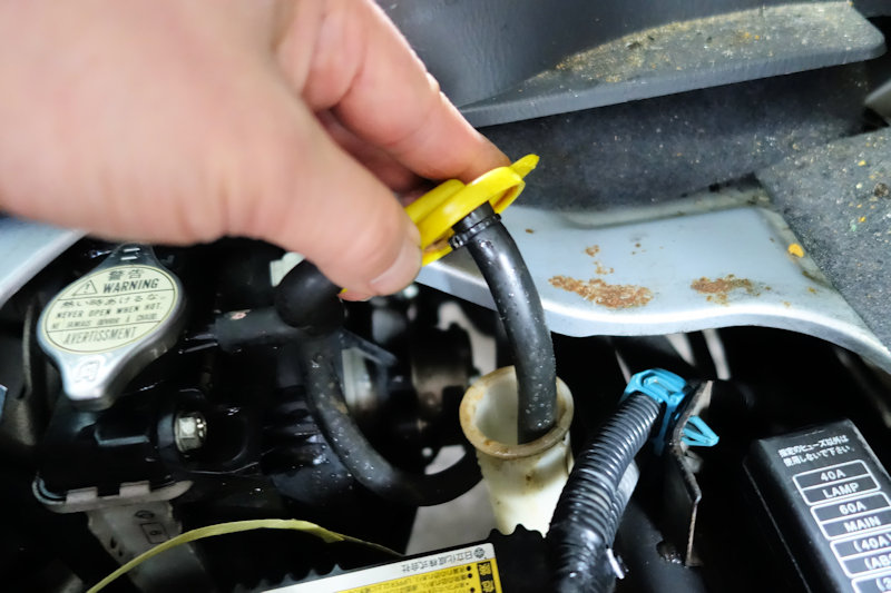 タンクの蓋を開けてみると、キャップの裏のホースが外れていました。