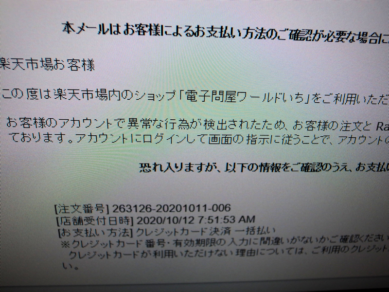 楽天から購入エラーの案内。と言うより詐欺メール。
