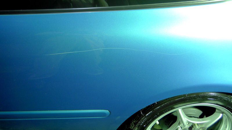駐車した際に壁側となったボディ面に、鋭利な物で後ろから前に向かって傷が入っている。