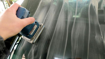 先ずは前の撥水剤と水垢を、機械を使って丁寧に磨いていきます。