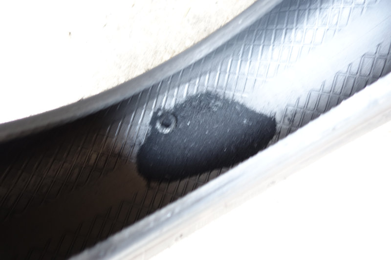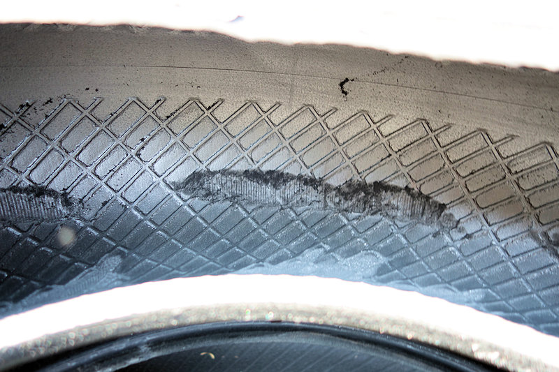 大量のゴムのカス。丸く見えるのはパンク修理の痕です。