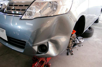 フェンダーも曲がっていましたが、タイヤを外して裏側から突貫作業を進めます。