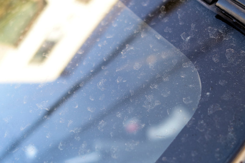 花粉の積もった車に雨などの水分が掛かると、花粉が弾けて