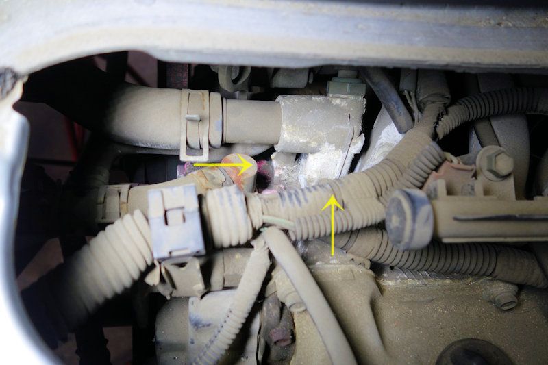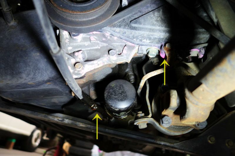 エンジンの下部は、やはりピンクの粉が吹き、オイルも滲んでいます。