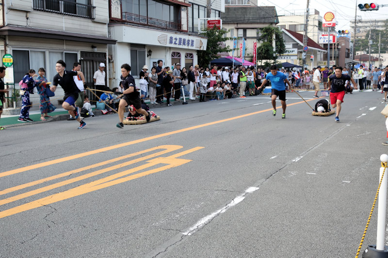 巨大な草履に人を乗せて、往路を引っ張って走り抜けます。