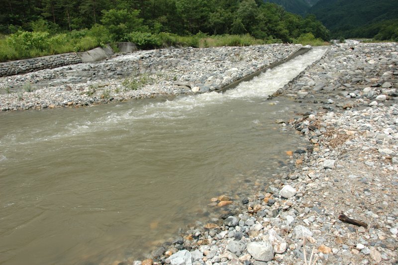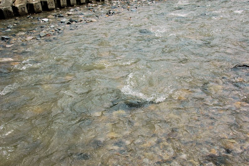 川上で雨が降ると水が濁り、水嵩が増してきます。