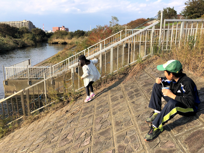 近くのコンビニでおやつを買い、河川敷で休憩~