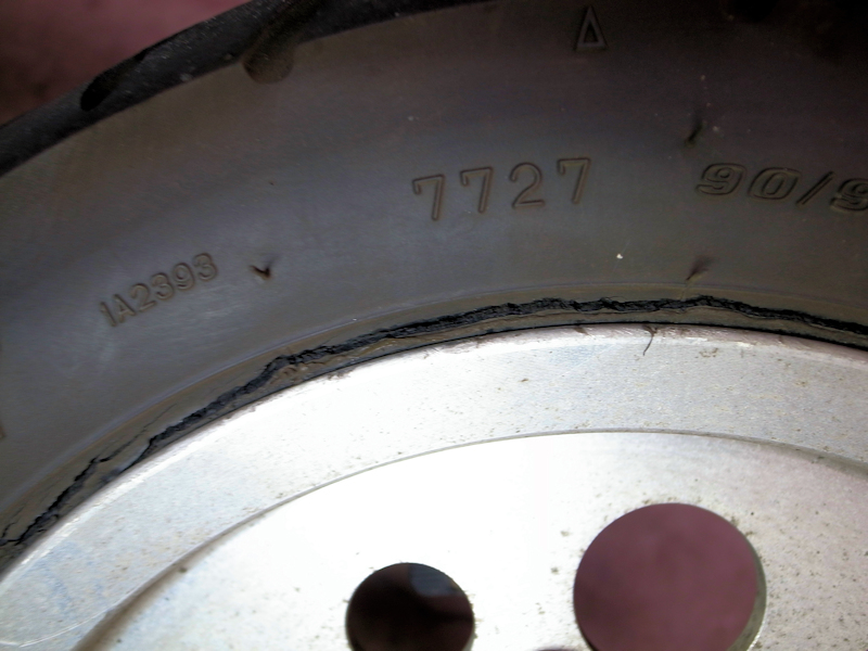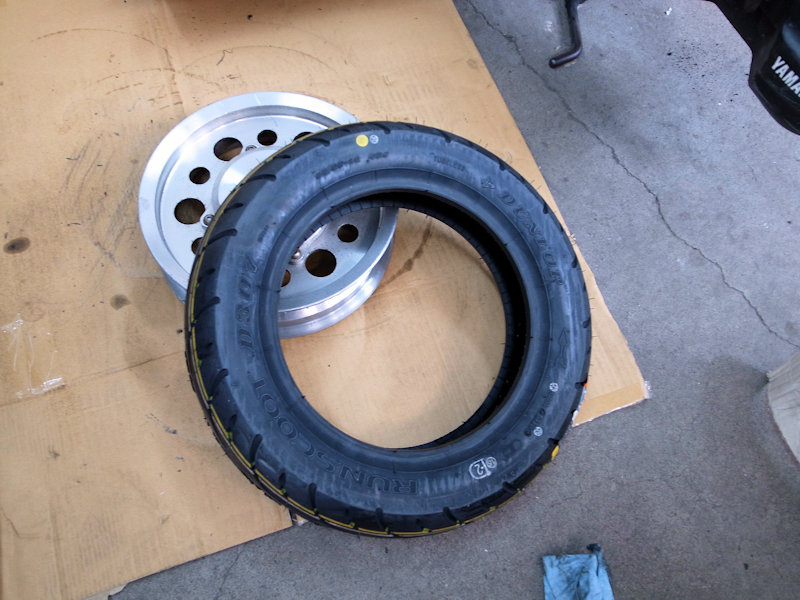 取り敢えず作業場へと向かい、ヒビだらけの後輪タイヤを交換します。
