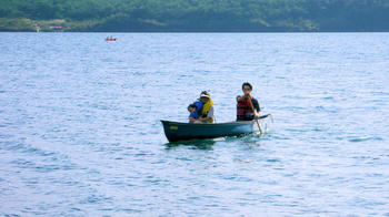 車に積んでいったカヌーで、湖の対岸まで行きました。