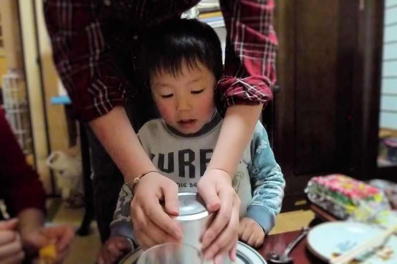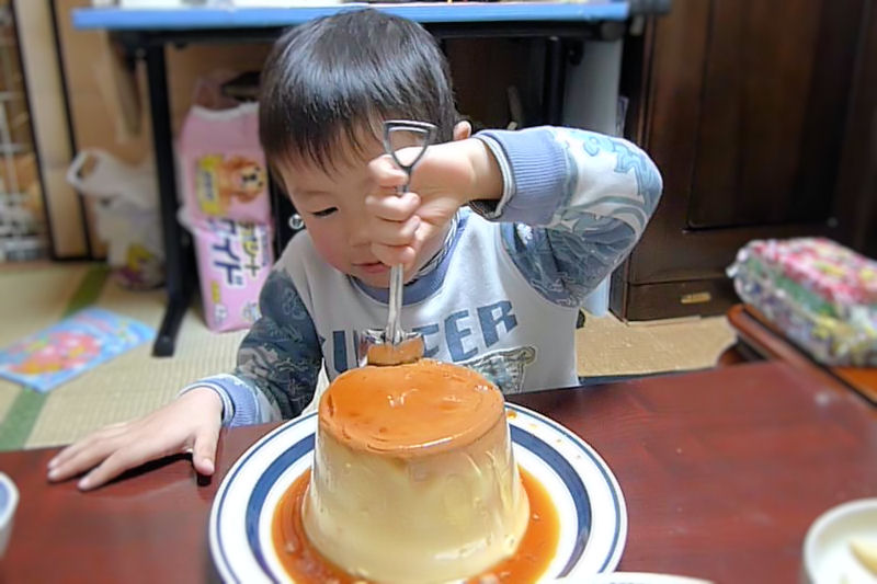 おまけで付いてきた、スコップ型のスプーンで先ずは息子がパクッ。