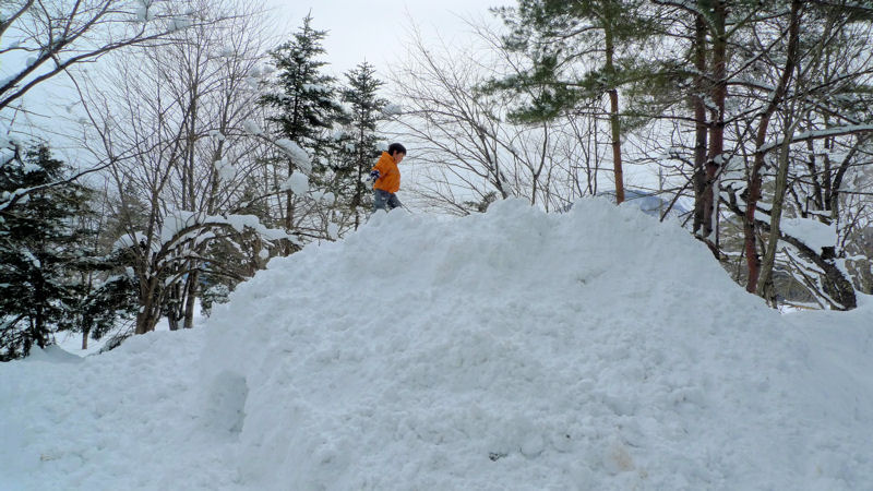 別荘に到着すると、建物の横に除雪された雪の山を息子が気に入った様で、