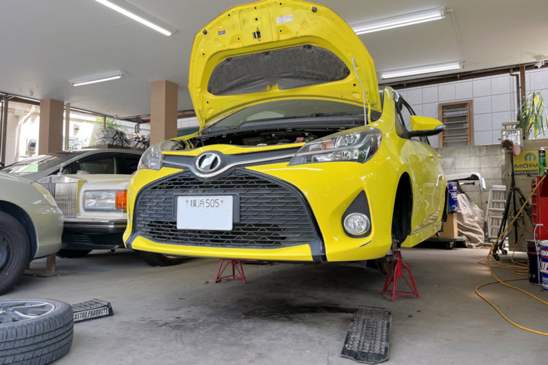 車を上げて点検いたします。