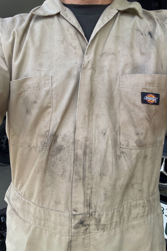 明るい色のツナギの時に、油仕事があるんです。(=_=)