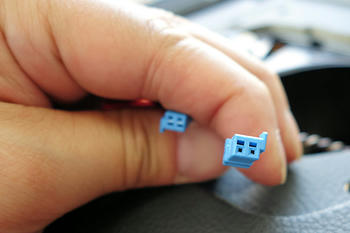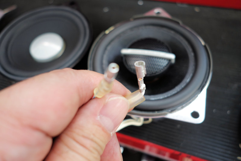 左が持ち込みのスピーカーでギボシ端子、右が純正のピン端子。