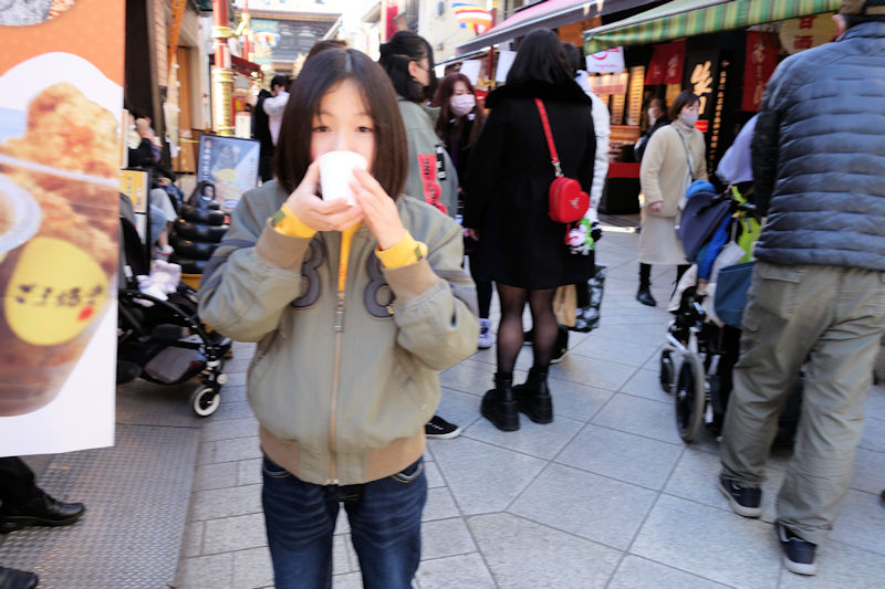 商店街の散策。住吉のくず餅を買ってから甘酒を頂く。