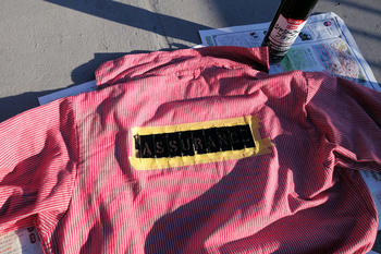先日購入し何度か洗濯をしたツナギに、ステンシルを入れます。