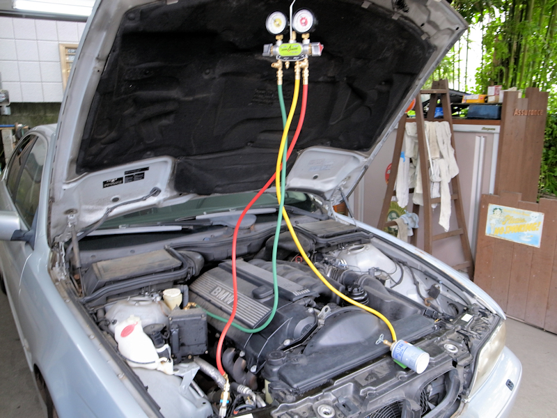 最後にエアコンガスと、コンプレッサーオイルを入れます。