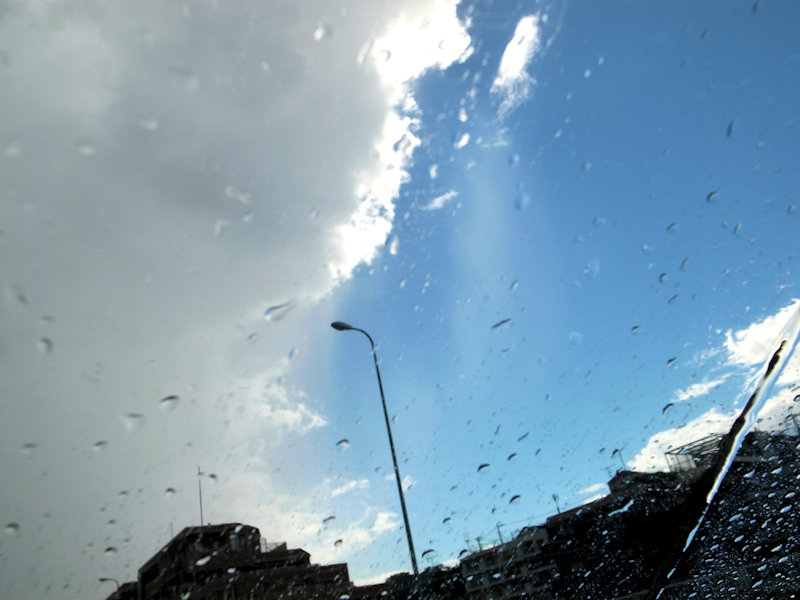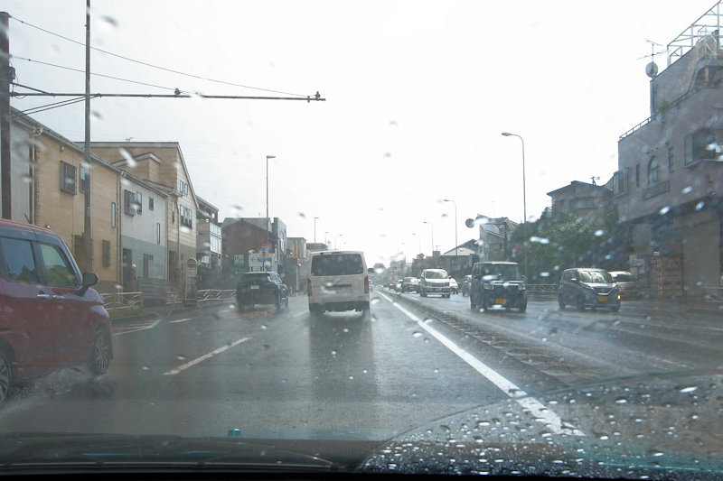 中央の白いモヤは、降っている土砂降りの雨粒です。