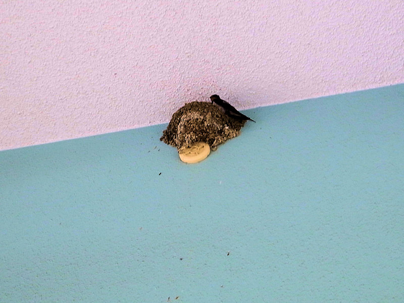 お車をお引き取りに行くと、駐車場の梁にツバメちゃん。