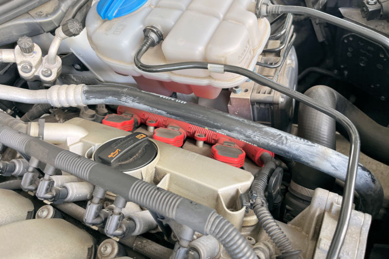 こちらは助手席側のプラグ。赤いのがイグニションコイルで、