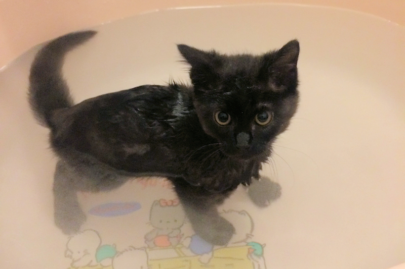 排泄を何度も促し、子猫用の温かいミルクをスポイトで給餌。