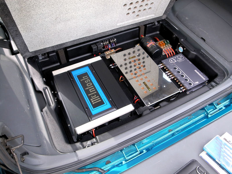 トランクの床蓋を持ち上げるとアンプ類が収まっています。