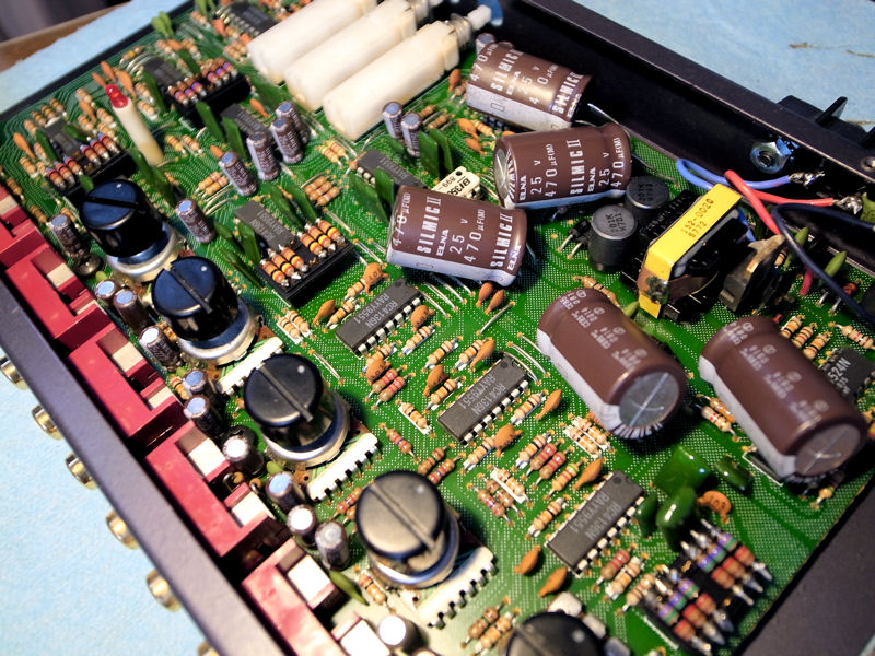 車体から取り外し蓋を開けてみましょう。丸い筒の様なコンデンサーが大小た~くさん。