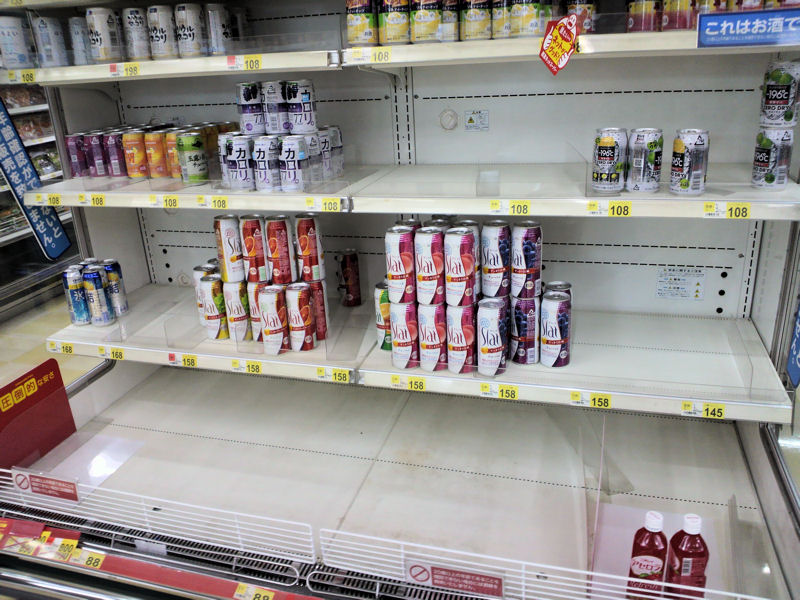 お米も、水も、ペーパー類など何もなく、お酒のコーナーも棚がガラガラ。