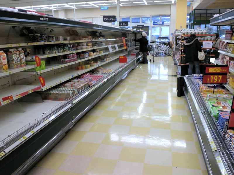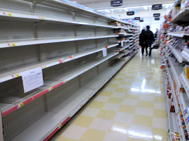 カップ麺の棚もガラガラ。さらに放射能被害が加わり、物不足に拍車が掛かりました。