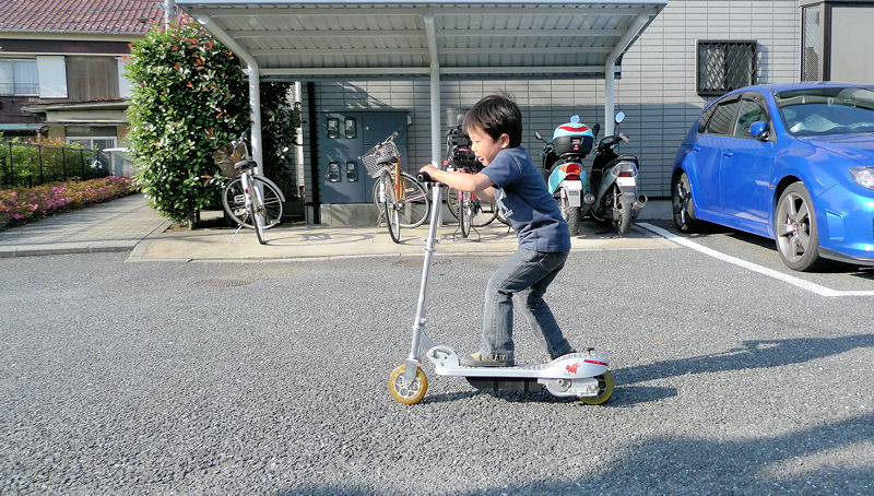 自転車と違うので転びはしないかと見ていると、フラフラしながらも器用に乗っています。