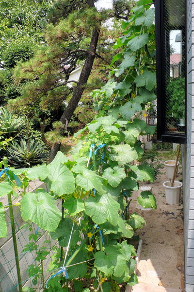 西側の出窓の上まで這わせてグリーンカーテンの出来上がり。