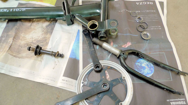 フロントフォーク、クランクなど全てバラして、ある程度錆落とし。ゴシゴシ…